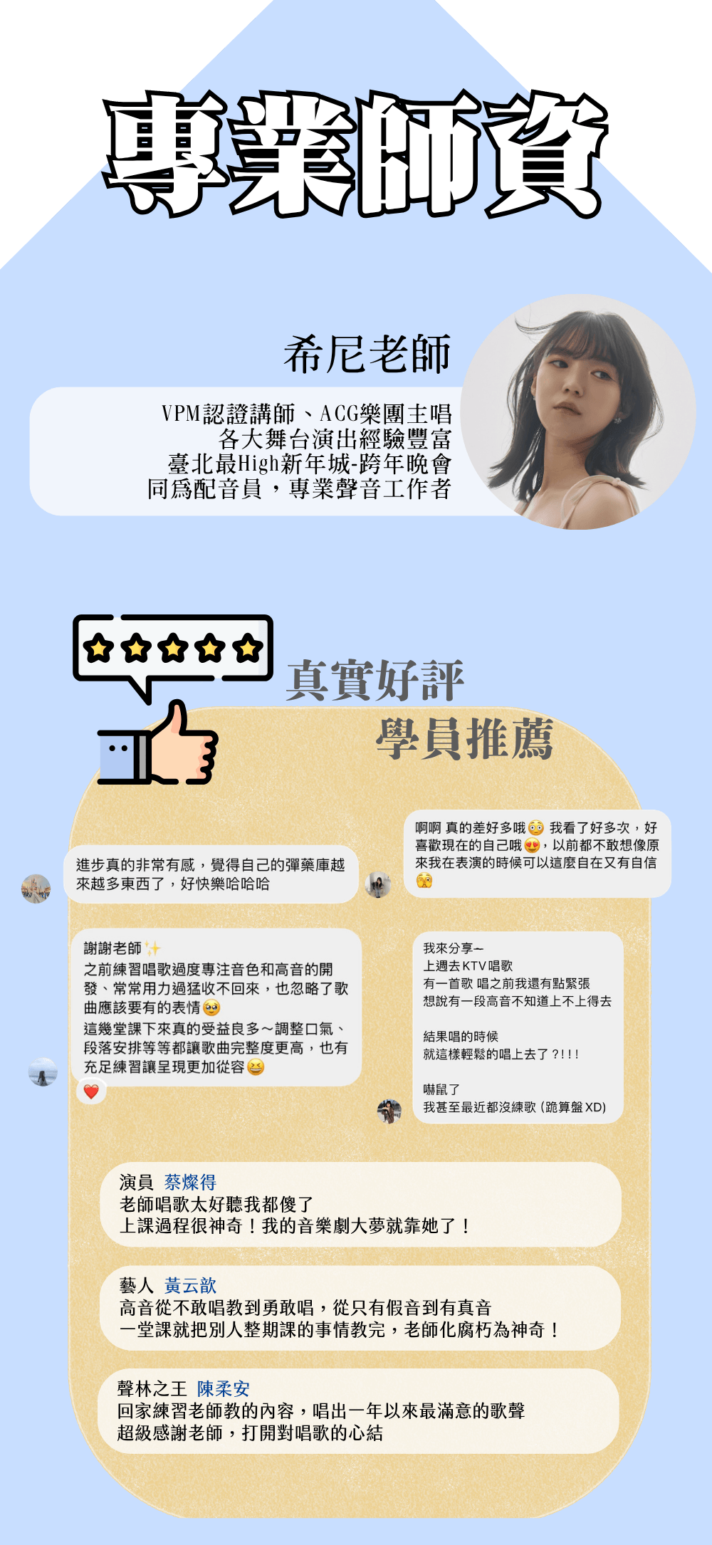 原本只是想試試看,沒想到一對一的分析這麼精準,讓我知道自己的聲音定位,也更敢唱出情緒,不再只是照著唱。